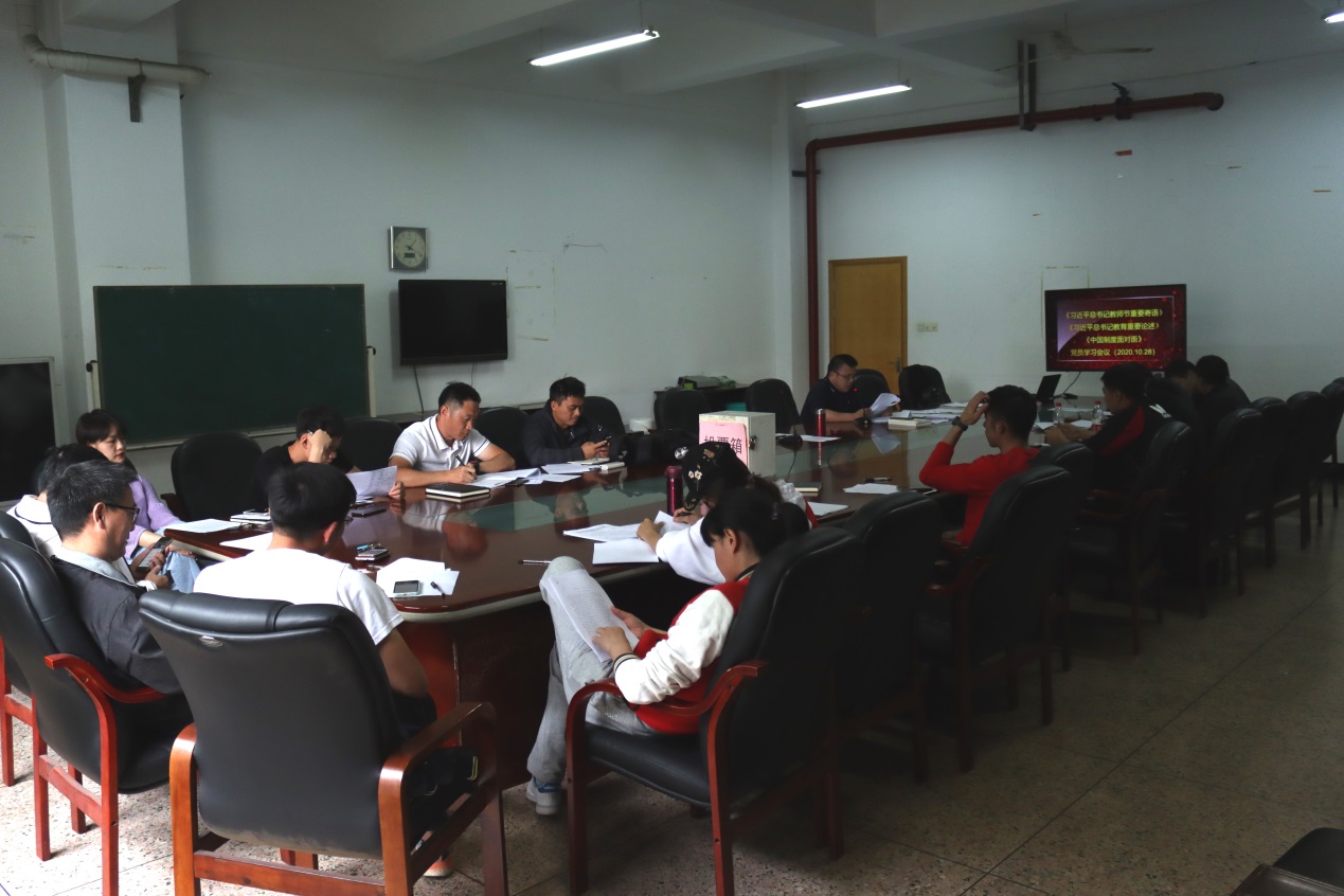 根据校宣传部相关要求,10月28日下午,体育工作部党直支召开全体党员大会,集中学习《习近平总书记教师节重要寄语》、《习近平总书记教育重要论述讲义》和《中国制度面对面》。